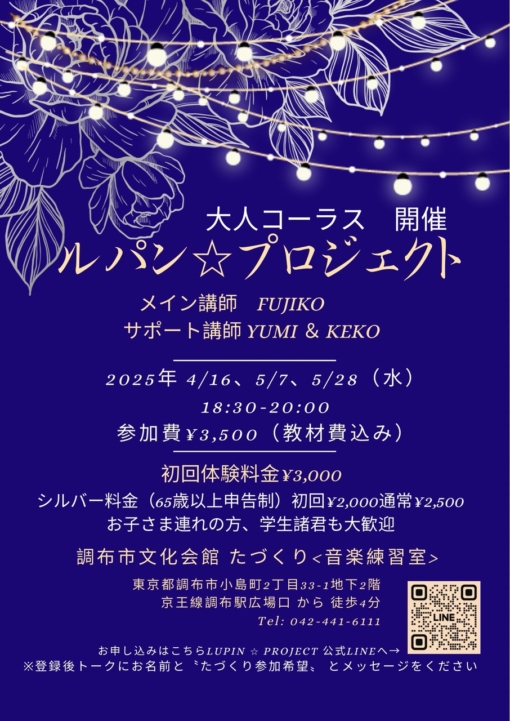4月のルパン☆プロジェクト”大人コーラス” Vocal and Trainer 桜もほぼ散りましたね〜(桜)『大人コーラス⭐︎ルパンプロジェクト』4月5月の開催日程です❣️★ルパン調布「たづくり」18:30~ 4/16(水)、5/7(水)、5/28(水)★ルパン清澄白河「ハタメキ」13:00~ 4/15(火)、5/20(火)お気軽にご参加ください🎵