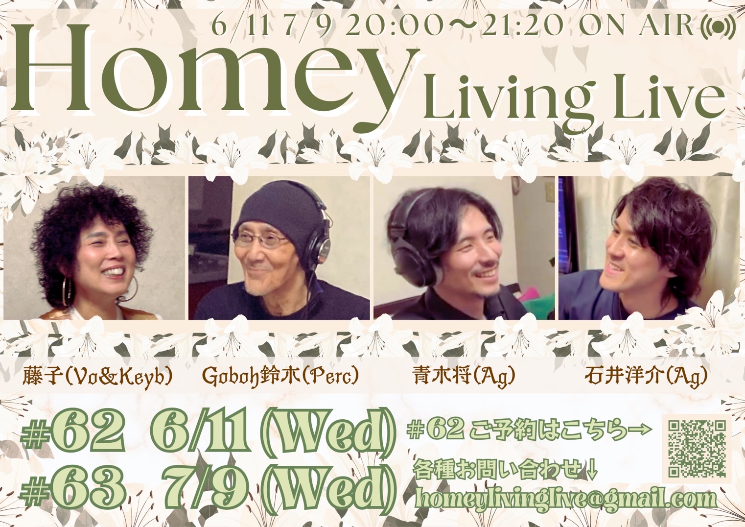 live情報❣ 6/11(水)『Homey Living Live #62』 Vocal and Trainer そろそろ梅雨にはいりそうですね。6月の「Homey Living Live #62」は6/11(水)20:00 On Airです 雨の日もお部屋で「Homey Living Live」の音楽を聴いて過ごしませんか?皆さまのご参加をお待ちしていますᡣ( ᐢ ᵕ ᐢ ) 👈詳細、ご予約はフライヤーからお願いします( ᴗˬᴗ) 藤子(vo,keyb) 青木将(g)石井洋介(g) Goboh鈴木(perc)