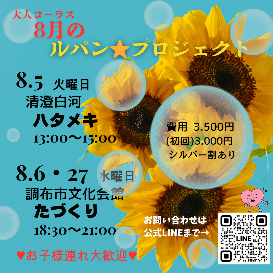 8月のルパン⭐プロジェクト”大人コーラス”🎵 Vocal and Trainer 8月のルパン⭐︎プロジェクト”大人コーラス”🎵◼︎調布たづくり8/6(水), 27(水) 18:30~20:30◼︎清澄白河ハタメキ8/5(火)13:00~15:00単発参加も大歓迎です。藤子HPのContact Form、またはフライヤーのQRコードからお問い合わせください