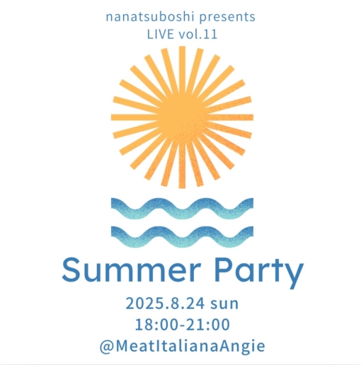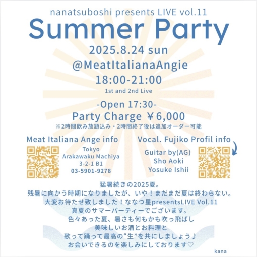 live情報❣8/24(日)『ななつ星プレゼンツ Vol.11』 Vocal and Trainer 8/24(日)ななつ星プレゼンツLive#11『Summer Party』@町屋Angie(アンジー)17:30 Open 18:00 Start藤子(vo)青木将(G)石井洋介(G)今年も暑い夏です🥵そんな夏シーズンの後半戦ではありますが、町屋でのPartyなLive開催♬なななつ星プレゼンツもついに10回を超え11回目!町屋の皆さん集合〜〜!一緒に飲んで踊って歌いましょう(・∀・)!!